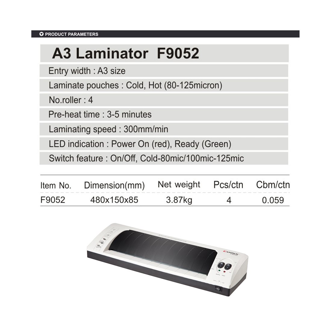 Ламинатор А3, COMIX, F9052, 4 вала, 80-125 мкм, 30 см/мин., Серый