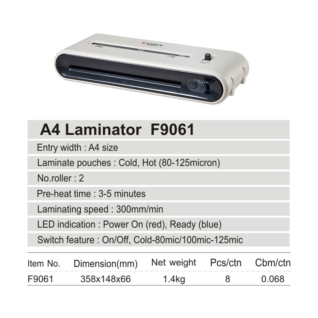 Ламинатор А4, COMIX, F9061, 2 вала, 80-125 мкм, 30 см/мин., Серый