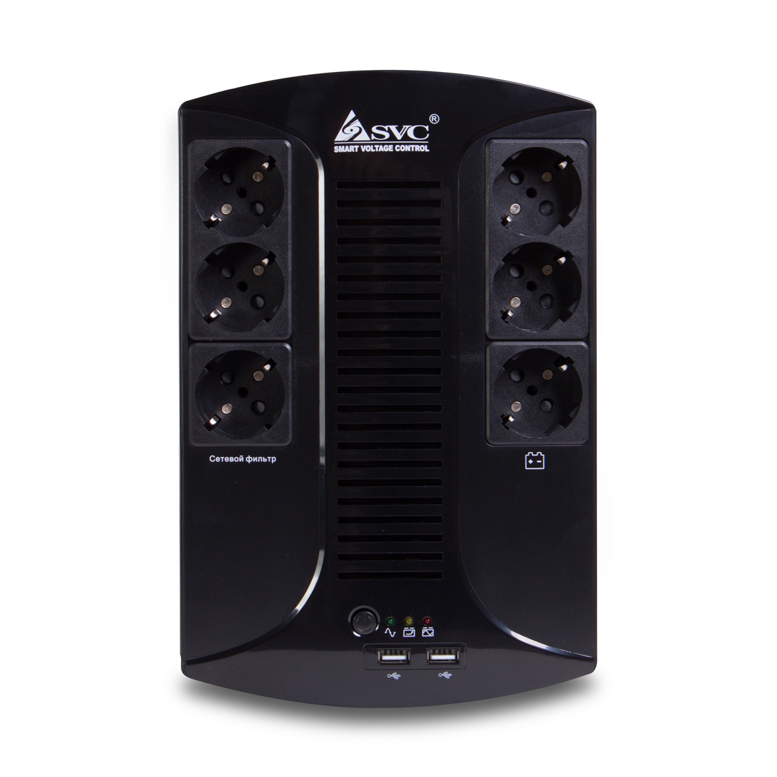 Источник бесперебойного питания, SVC, U-650-L, USB, Мощность 650ВА/390Вт, Диапазон работы AVR: 145-290В, Бат.: 12В/7 Ач х 1 шт.., 6 вых.: Shuko CEE7(3 с работой от батареи, 3 сетевой фильтр), USB 5В/2А*2 шт., Чёрный