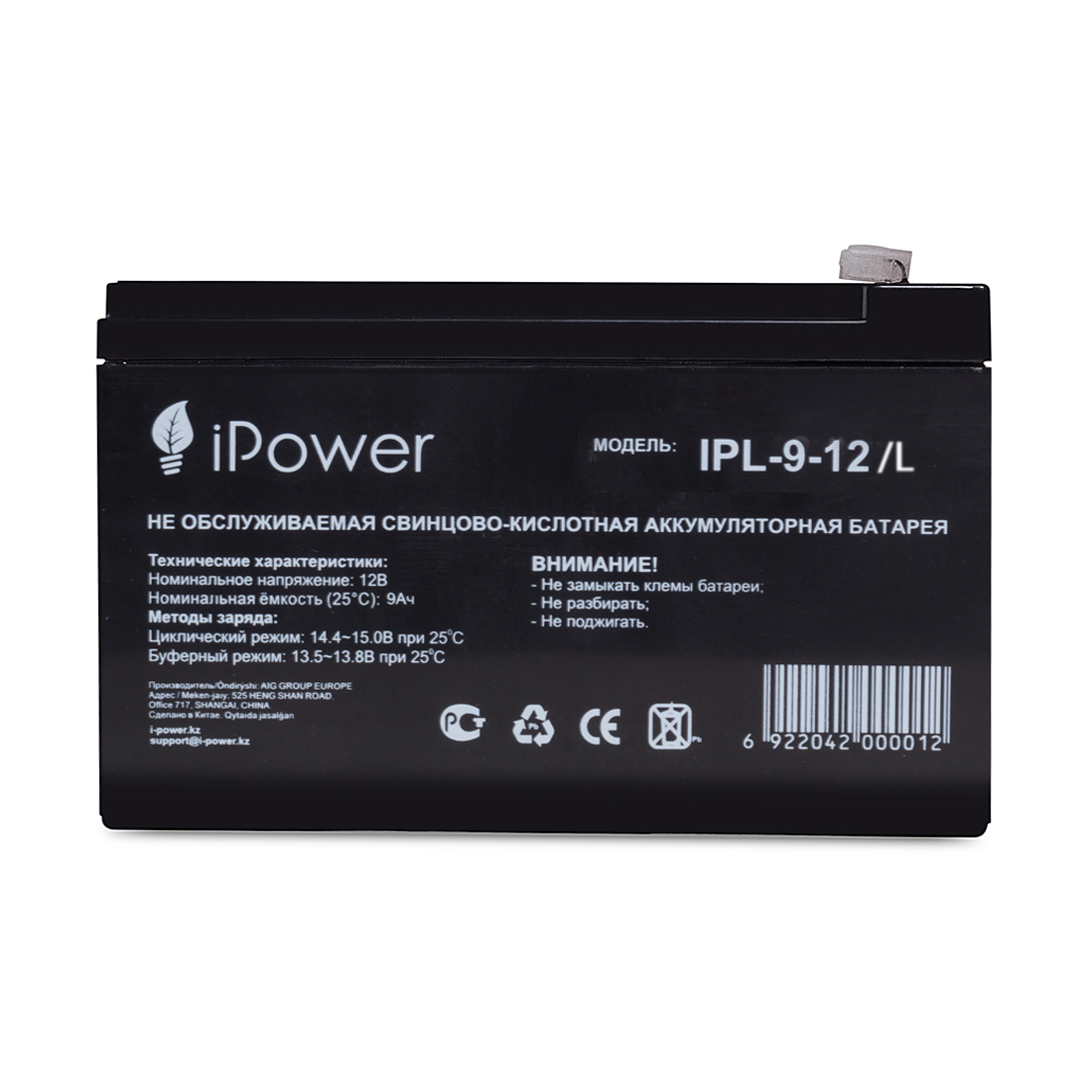 Батарея, IPower, IPL-9-12/L, Свинцово-кислотная 12В 9 Ач, Размер в мм.: 151*65*100