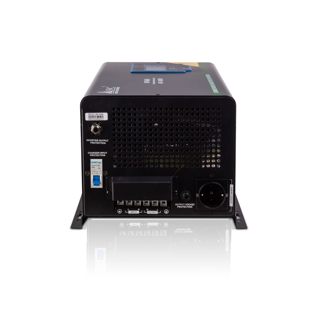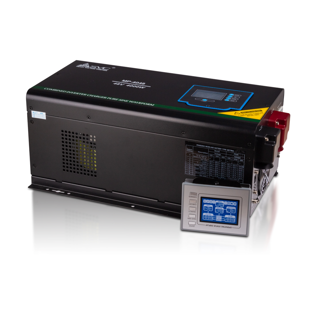 Инвертор, SVC, MP-4048, Мощность 4000ВА/4000Вт, Рабочее напряжение: 160-265B, Вход 48В/220В, Выходное напряжение 160-265В, Чистая синусоида, Зарядный ток 45 А, Время переключения режимов 4-6 мс, Кулер 9 см, Клеммное подключение, Чёрный