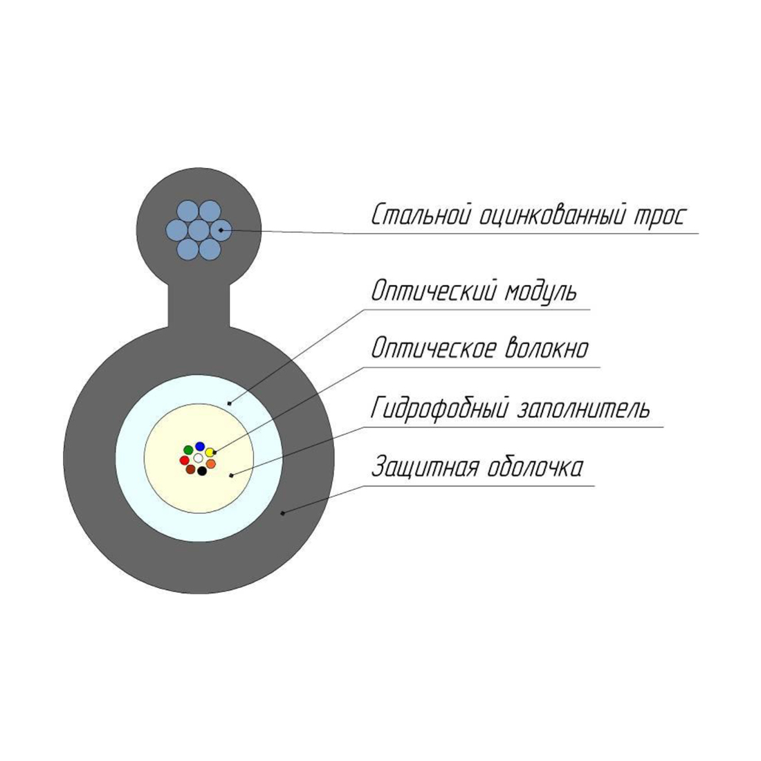 Кабель оптоволоконный, СКО, ОКТ-4(G.652.D)-Т/СТ 9кН, предназначен для подвески на опорах воздушных линий связи, столбах городского освещения и между зданиями.