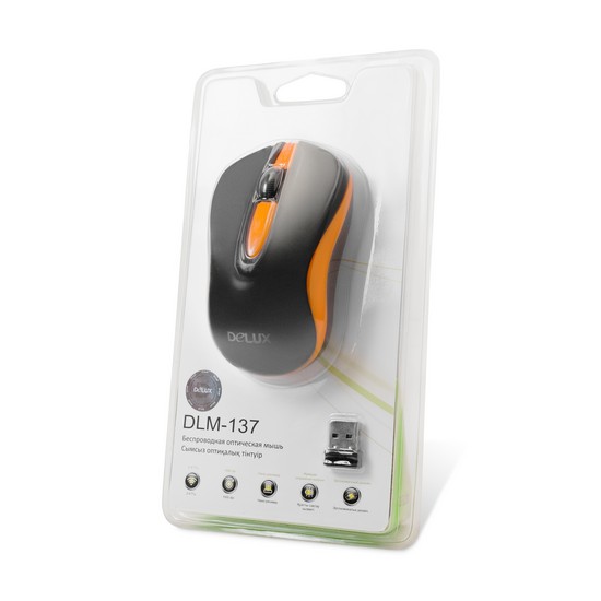 Компьютерная мышь, Delux, DLM-137OGB, 3D, Оптическая, 1000dpi, Беcпроводная 2.4ГГц, Нано-ресивер, Эффективная дистанция 10 м., Размер: 102,5*61,1*40,85 мм., Чёрный