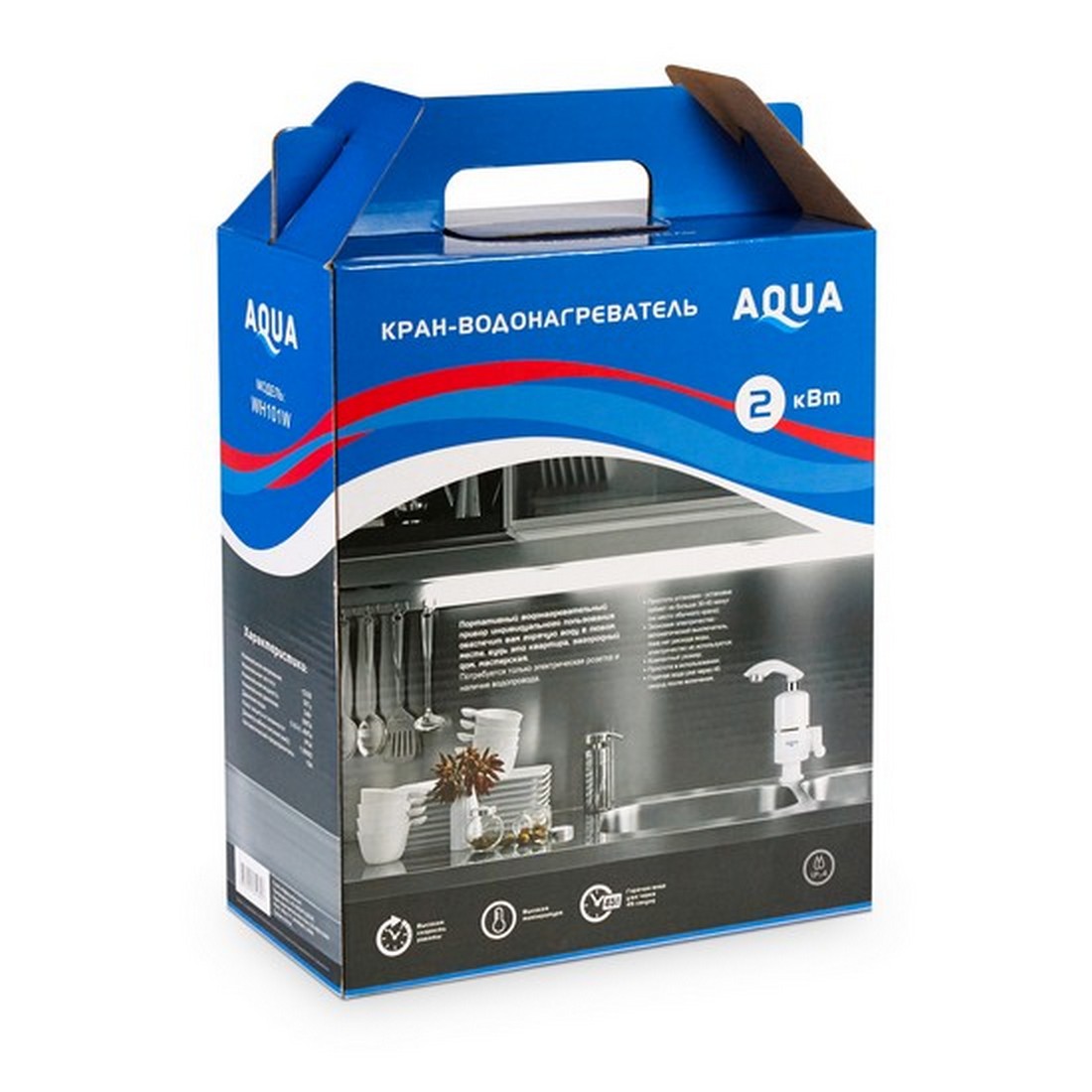 Бытовой кран с подогревом воды, AQUA, WH101W, 220В, Температура нагрева до +60 С, Длина кабеля 1.5м, Белый