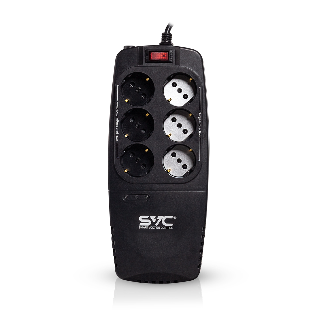 Стабилизатор (AVR), SVC, AVR-1200-U, Мощность 1200ВА/600Вт, Диапазон работы AVR: 176-276В, Тип выходных разъёмов: Schuko х 6 шт., LED-индикаторы, Защита телефонной линии, Чёрный